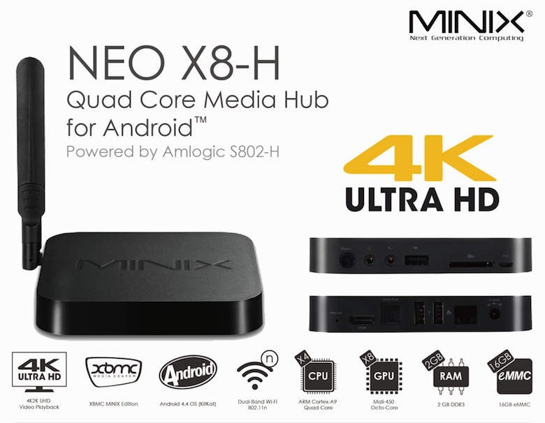 The Minix Neo X8H features an Amlogic S802 Quad Core 2 Ghz with Android 4.4 OS, 2GB of Ram and 16GB of eMMS Storage. The X8H also includes a Octo 8-Core Mali-450 GPU, 2G/8G Dual Band WIFI, 2.4G/5.8G Bluetooth V4.0 - XBMC Comes Pre Installed and included is a Free RJ45 Ethernet Adapter.